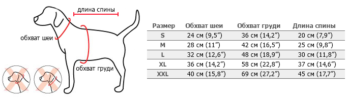 Переконайтеся, що всі параметри вашого вихованця відповідають зазначеним розмірам. В обхваті грудей і шиї має бути вільна посадка виробу, щоб одяг не стискував рухів собаки.